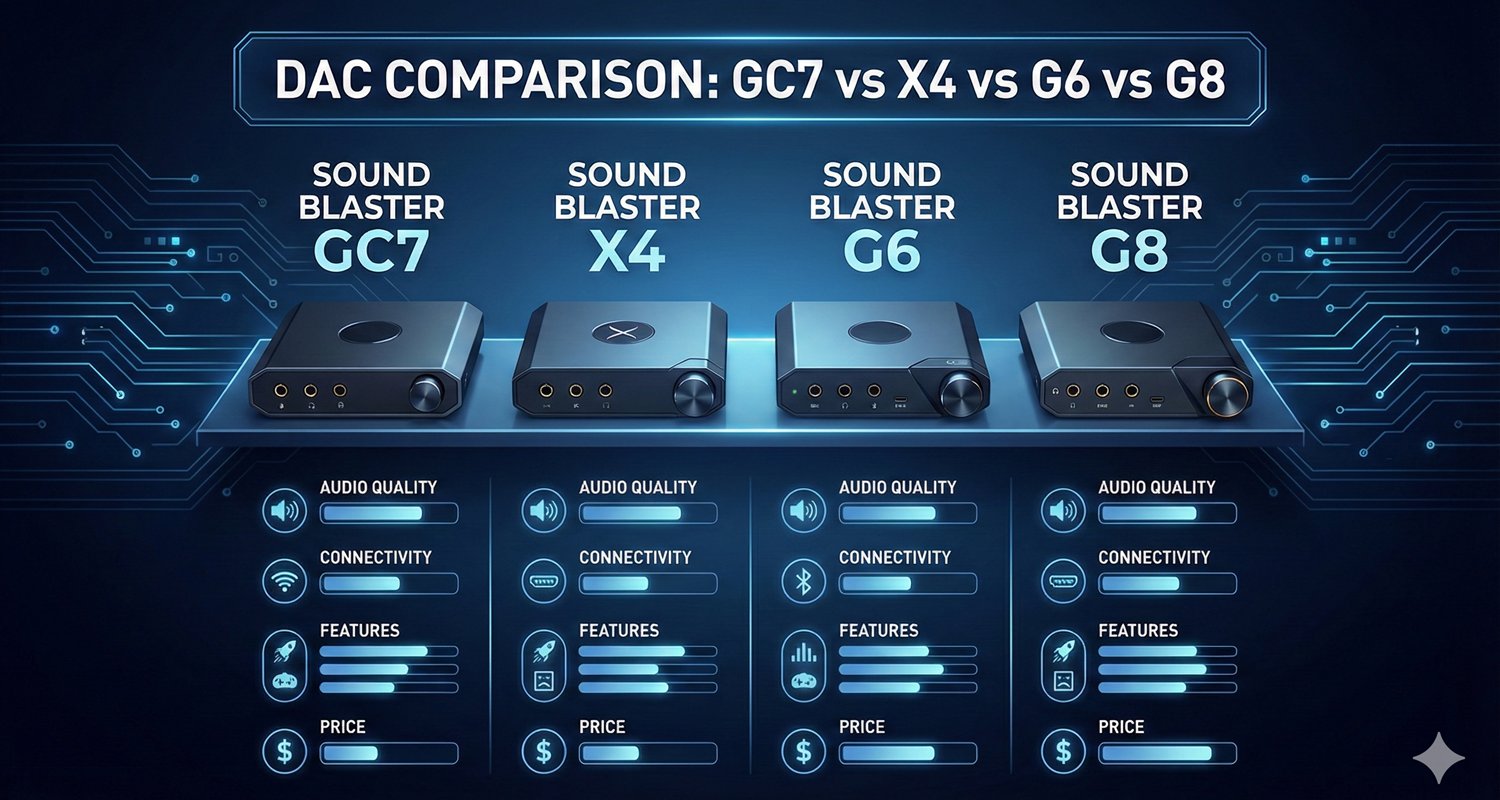 By SoundMaxPro Staff Share Share Choosing the correct external audio processor for a desktop computer or gaming console requires matching specific hardware specifications to your listening environment. Creative Labs currently divides its product stack into distinct Digital-to-Analog Converters (DACs) targeted at different use cases: the Sound Blaster GC7, X4, G6, and the newer G8. Note: If you buy something from our links, we might earn a commission. See our affiliate disclosure statement. This technical report documents the silicon architectures, amplification stages, and software ecosystems driving these four devices. We examine the performance differences between the discrete Xamp bi-amplification deployed in the G6 and G8 against the hardware-level digital signal processing of the GC7 and X4. The analysis also breaks down output impedance mismatching, microphone noise floor limits, and modern console interconnectivity, detailing how the dual USB-C and HDMI ARC inputs on the G8 compare to legacy optical connections. Review the data matrix and hardware specifications below to determine which audio interface aligns with your hardware requirements. Comparing Creative Sound Blaster Digital to Analog Converters GC7 X4 G6 and G8 SoundMaxPro Architecture Amplification Software Interface Microphone Power Data Matrix Availability Assessment FAQ Updated till January 2026 Comparing Creative Sound Blaster DACs GC7 vs X4 vs G6 vs G8 Audio engineering and gaming peripherals have created a specialized class of external digital to analog converters. Desktop computers and gaming consoles require external audio processing. This report analyzes four units from Creative Labs. We document their silicon topologies, amplification stages, output impedance dynamics, and software platforms. Silicon Foundations and DAC Architectures The digital to analog converter dictates the fundamental noise floor, dynamic range, and resolving capability. The four devices analyzed utilize vastly different silicon implementations. They target different user requirements ranging from pure audio playback to multi channel digital processing. The Cirrus Logic Implementations The Sound BlasterX G6 and the Sound Blaster G8 prioritize signal integrity and high resolution decoding. They utilize premium silicon from Cirrus Logic. The Sound BlasterX G6 operates on a 32-bit / 384 kHz USB DAC architecture. Technical teardowns indicate the underlying silicon is the Cirrus Logic CS43131. This chip allows the G6 to achieve a dynamic range of 130 dB. The Sound Blaster G8 deploys a dual DAC architecture. It incorporates two discrete Cirrus Logic CS43198 chips. This dual mono configuration lowers the noise floor, mitigates crosstalk, and improves channel separation. This setup matches the 130 dB dynamic range of the G6 while achieving a Total Harmonic Distortion plus Noise (THD+N) measurement of 0.00018 percent. Technical Anomaly Notice Advanced acoustic analysis of these specific Cirrus Logic DACs reveals potential issues related to their proprietary Dynamic Range Enhancement technology. In an effort to conserve power, these DACs operate their analog paths in Class H mode. During transient voltage shifts, an audible high frequency click artifact can manifest. Multi Channel and DSP Architectures The Sound Blaster X4 and GC7 prioritize multi channel output flexibility and hardware level digital signal processing. The Sound Blaster X4 supports up to 7.1 discrete and virtual audio channels. It utilizes a lower tier DAC identified as the Cirrus Logic CS43918 or the legacy CS4382. The X4 offers a dynamic range of 114 dB. The Sound Blaster GC7 uses a hybrid approach targeted at streamers and console gamers. Its primary DAC maxes out at 24-bit / 192 kHz with a 120 dB SNR. It houses both the proprietary SB Axx1 audio processor and the dedicated SXFI Ultra DSP chip directly on the printed circuit board. Dynamic Range Infographic Reported Dynamic Range in Decibels (Higher is Better) Amplification Stages and Transducer Dynamics The headphone amplification stage determines the maximum volume, the frequency response accuracy, and the audibility of the noise floor. Discrete Xamp Bi Amplification The Sound BlasterX G6 and Sound Blaster G8 employ a proprietary custom designed Xamp discrete headphone bi amplifier. The Xamp architecture amplifies the left and right audio channels individually. This bi amplification occurs across all three frequency spectrums before delivering the combined analog signal to the output jack. Output Impedance Rules The distinction between the 1 ohm output impedance of the G6 and G8 versus the 10 ohm output impedance of the GC7 and X4 represents an operational limitation. An amplifier output impedance should be no more than one eighth of the headphone input impedance. Because the GC7 and X4 possess a 10 ohm output impedance, they are mismatched with low impedance In Ear Monitors. This 10 ohm output impedance causes voltage division across the frequency spectrum. This typically manifests as a bloated boost in the bass frequencies. Interconnectivity and Console Integration The landscape of console audio interconnectivity changed severely with the launch of the PlayStation 5 and Xbox Series X. Both consoles eliminated the standard TOSLINK Optical audio output. The Sound Blaster G8 integrates two distinct technological solutions. It features Dual USB-C inputs and an HDMI ARC interface. The inclusion of dual USB-C ports allows the G8 to ingest and mix audio data from two separate digital sources. The user can route game audio through HDMI ARC while connecting a smartphone to the second USB-C port to handle voice chat. Technical analysis of the G8 HDMI implementation reveals a limitation. The device utilizes standard HDMI 2.0b ARC rather than the modern HDMI 2.1 eARC standard. Standard ARC suffers from bandwidth limitations. It cannot transmit uncompressed multi channel 5.1 or 7.1 LPCM audio. Users must rely on lossy compressed Dolby Digi